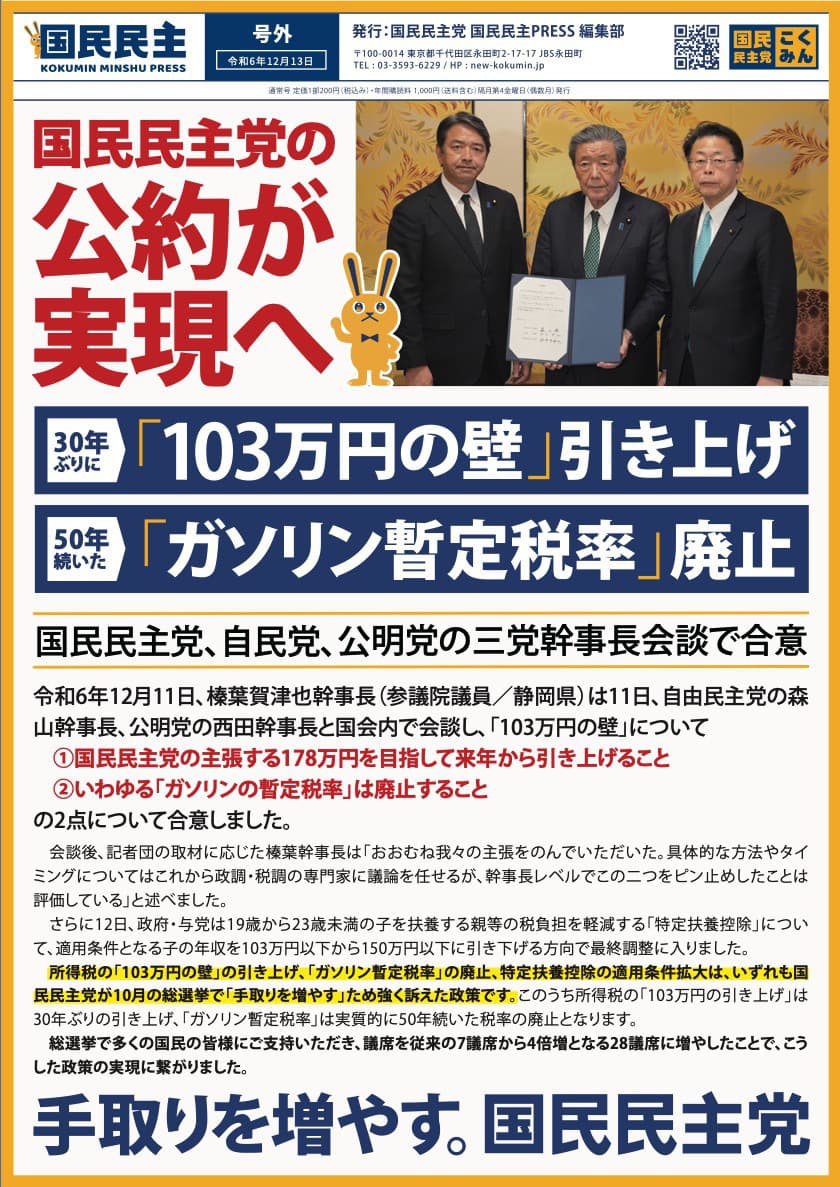 【玉木代表】先ほど総理官邸に参りまして、高市総理に我々の「手取りを増やし、自分の国は自分で守る経済政策」を申し入れてまいりました。 大きく、日本の経済を強くしていこうという方向については高市政権と政策的にも重なるところは多々あると思いますけれども、我々としてはまずそのためにも、昨年の12月に3党で合意したガソリンの暫定税率の廃止と「年収の壁」の引き上げ、これはもう何としても実現すべきだということを改めて総理にもお伝えしました。