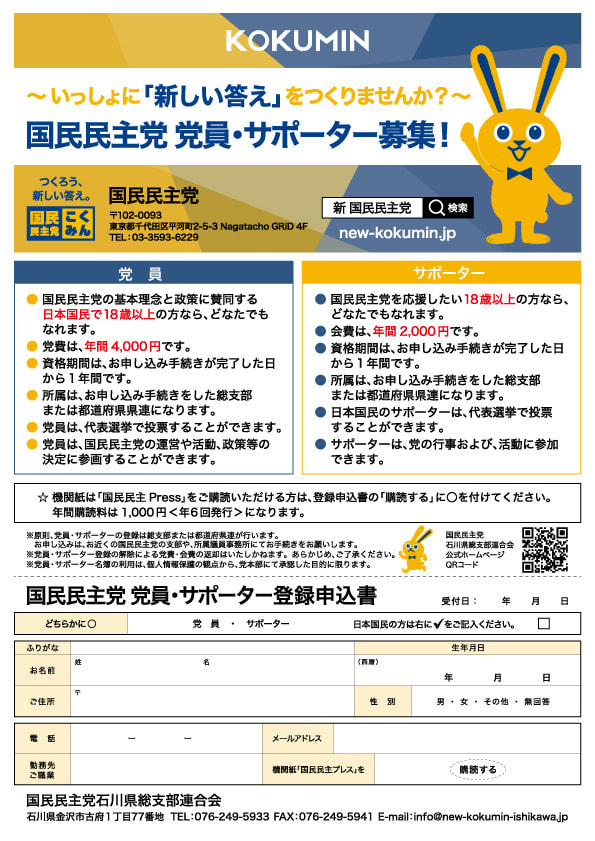 国民民主党では、より緩やかな形でご支援いただける方向けに、サポーター制度も設けております。